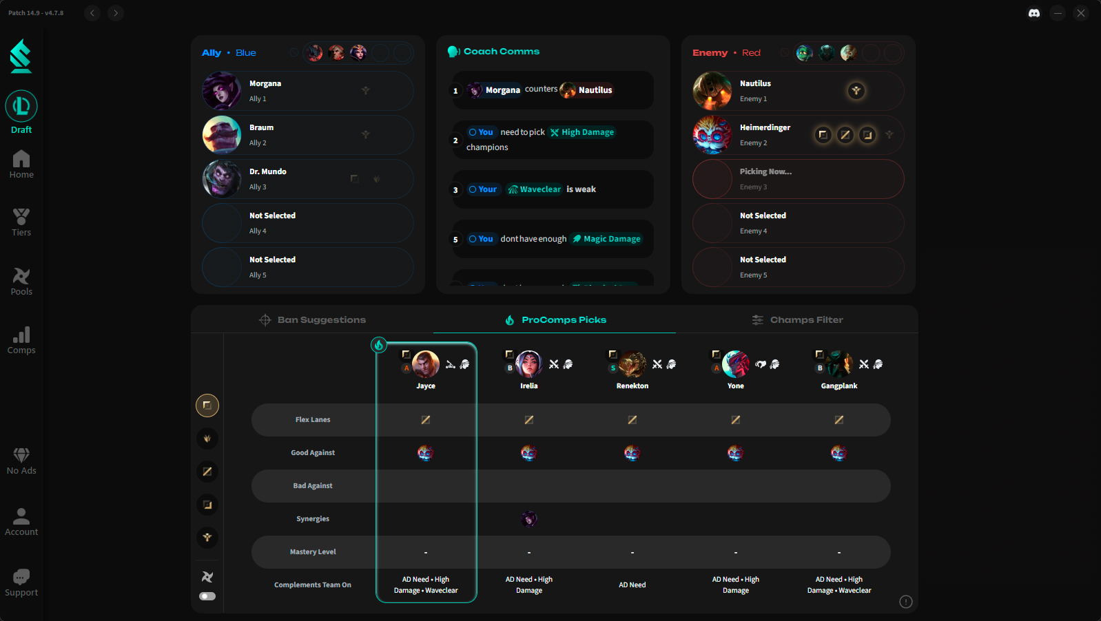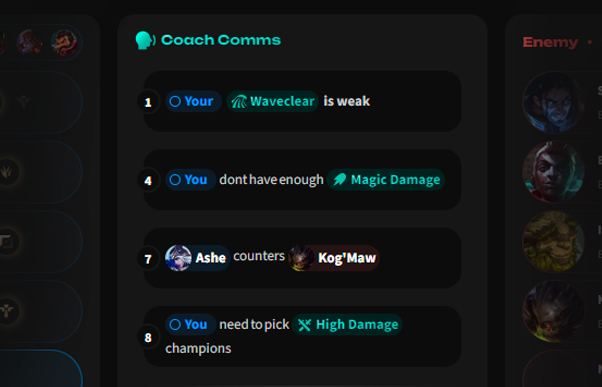 Get champion suggestions, tips, and insights at each step of a League of Legends draft from what feels like a virtual coach.
