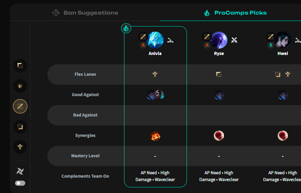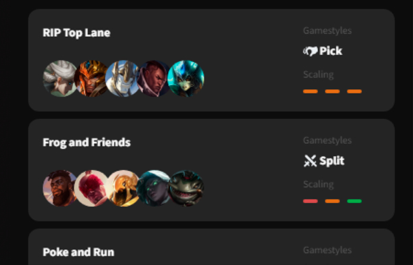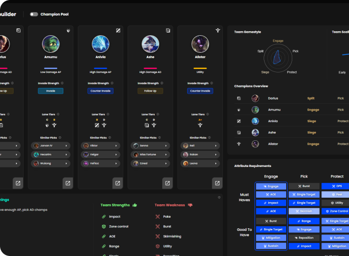 Craft the perfect team composition with just a few clicks based on selected champion pools, counter picks, preferred gamestyles, and scaling preferences.